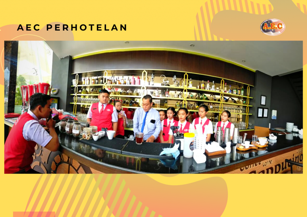PESERTA DISINI BELAJAR BAGAIMANA CARA MENJADI BARTENDER YANG HANDAL SERTA CARA UNTUK MEMBUAT MINUMAN YANG BERANEKARAGAM DAN NIKMAT. DENGAN DEMIKIAN LULUSAN DARI AEC PERHOTELAN INI AKAN MENJADI ORANG YANG BERKOMPETEN DISEMUA BIDANG , MULAI DALAM SERVICE MAUPUN PRODUCT YANG SIAP DI SERAP DI DUNIA KERJA MAUPUN MENJADI PENGUSAHA DIBIDANG JASA MAUPUN KULINER.